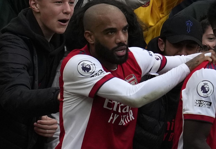 Arsenal’s Alexandre Lacazette celebrates as Bukayo Saka scores against Manchester City at Emirates Stadium