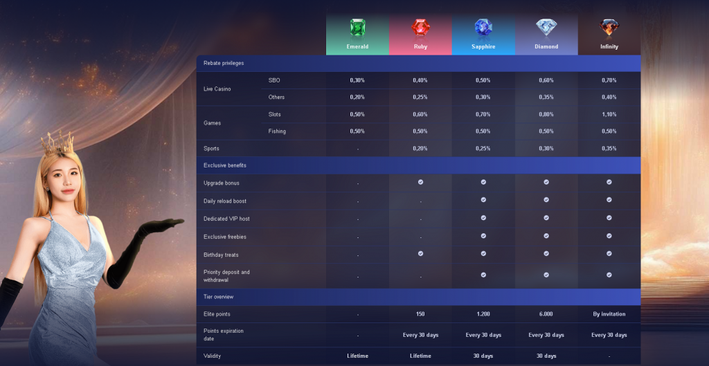 The SBOTOP VIP program is tiered, with levels ranging from Emerald, Ruby, Sapphire, Diamond, to Infinity. Start earning points now through your turnover and enjoy the best 24-hour service with SBOTOP.